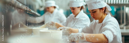 Confectioners who glaze and decorate cakes in a factory.