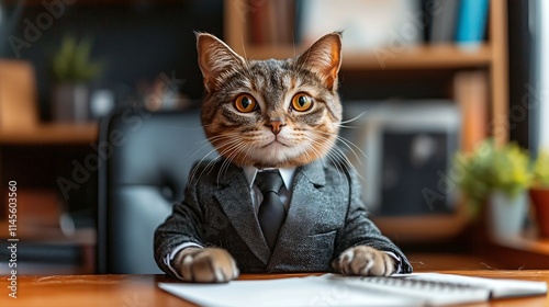 Confident and Poised Korat Cat Dressed in a Tailored Business Suit Sitting Professionally at a Contemporary Office Desk Exuding an Air of Authority and Success