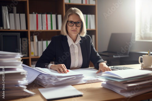 Confident and poised tax preparer working diligently at her desk, surrounded by stacks of paperwork and financial documents, generative ai