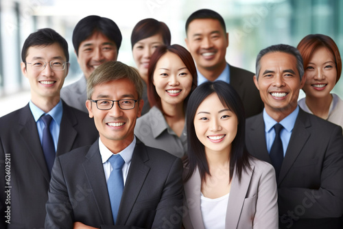 Confident Asian businesspeople in powerful poses, donning business suits, symbolizing a dynamic corporate team. Captivating unity and professionalism. generative AI.