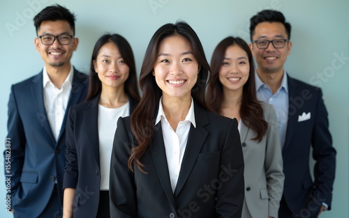 Confident Asian businesspeople in powerful poses, donning business suits, symbolizing a dynamic corporate team. Captivating unity and professionalism. generative AI. High quality