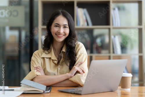 Confident Asian businesswoman using laptop calculator Paperwork for financial work, calculations on the desk, tax, report, accounting, statistics. Analytical research concept.