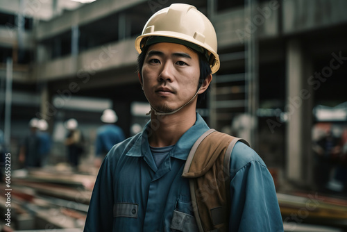 Confident Asian engineer standing in factory , Asia worker employee in hard hat safety work in factory. Generative ai