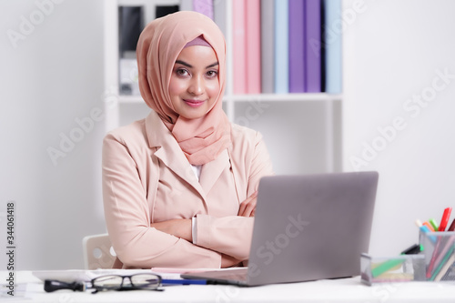 Confident Asian Muslim businesswoman in islamic dress working in office or workplace at company. business concept.