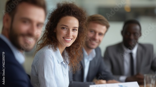 Confident Business Group: A group of professionals, focused on success, smiles warmly at the camera, capturing the essence of teamwork.