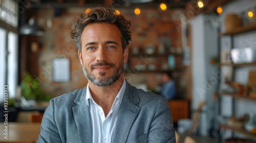 Confident Business Professional in Modern Office Setting with Brick Wall and Shelves in Background