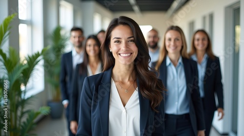 Confident Business Team Walking in Modern Office, Smiling Professionals in Suits, Leadership, Success, Corporate Environment Vector Illustration