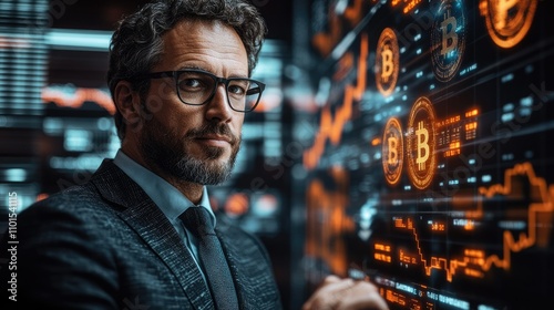 Confident businessman analyzing cryptocurrency market data on a futuristic screen.