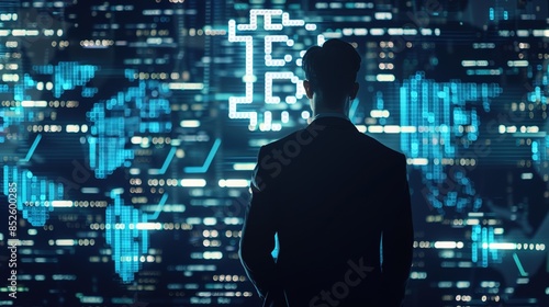 Confident Businessman Analyzing Real-Time Cryptocurrency Data on Futuristic Digital Interface