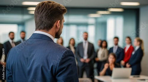 Confident businessman giving a presentation in front of crowd in meeting conference seminar room. Leadership authority teamwork in business concept