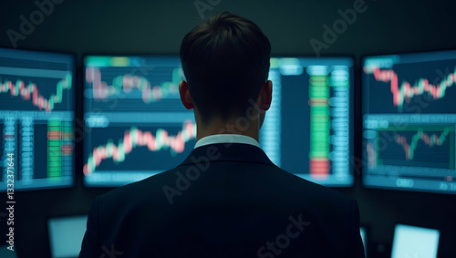 Confident Businessman in Front of AI Stock Market Screens: A Vector Illustration of Financial Expertise