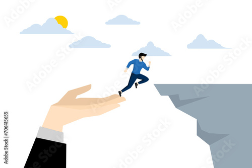 Confident businessman jumping from helping giant hand to reach cliff target. Support in business for success, guidance and motivation to overcome business obstacles, career growth concept.