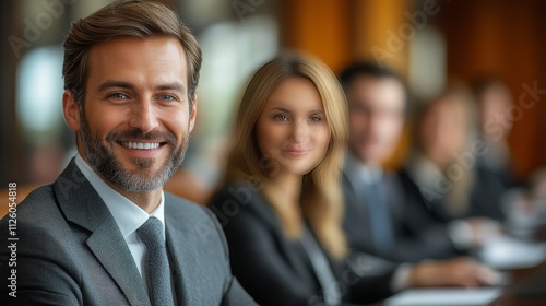 Confident Businessman Smiling at Conference with Colleagues in Background