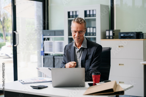 Confident businessman working on finance analysis with a tablet and laptop at office desk.