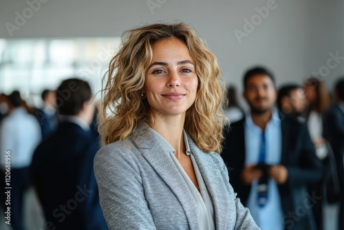 Confident Businesswoman in Modern Office Environment with Colleagues Engaged in Networking and Collaboration