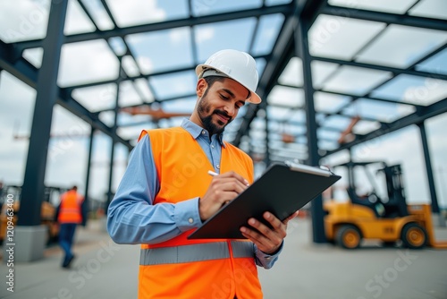 Confident Construction Worker in Safety Gear Writing Notes on Clipboard at Modern Building Site with Forklifts in Background