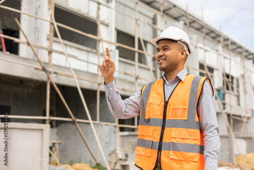 Confident engineer handsome man or architect looking forward with white safety helmet in construction site. Standing at modern building construction. Worker asian man working project building