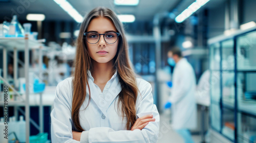 Confident female scientist in lab coat with folded arms in a bustling laboratory setting, embodying professionalism