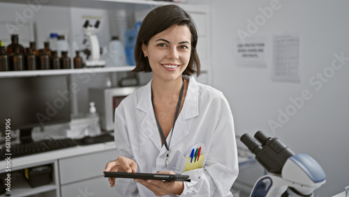 Confident hispanic scientist, smiling young adult woman using touchpad, enveloped in medical research at lab