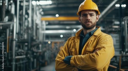 confident male factory worker in protective gear standing proudly in industrial setting machinery and production lines visible in background strong lighting emphasizes determination and skill