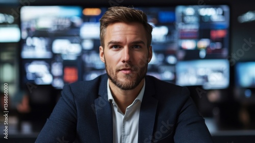 Confident Man in Dark Blue Business Suit with Multiple Screen Background