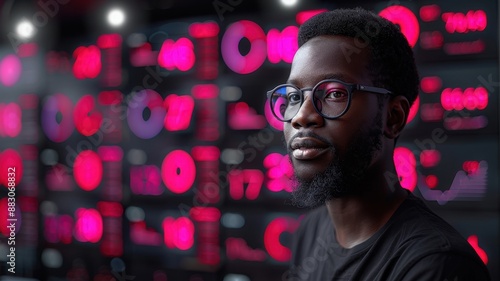 Confident man in modern tech setting with digital interface background, illuminated by vibrant pink and red lights.