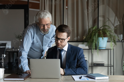Confident mature businessman executive in glasses with colleague working on online project using laptop, senior mentor coach training new employee, helping with corporate software, instructing