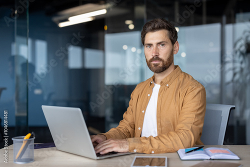 Confident mature businessman using laptop in modern office setting. Open notebook, pen, smartphone on desk indicate organized, productive work environment. Business, technology, focus.