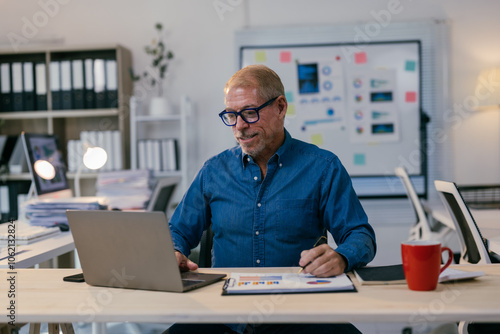 Confident mature entrepreneur sitting at desk in modern office, using laptop and examining financial reports, working with concentration and focus on project