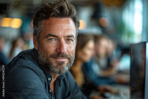Confident middle-aged man with a beard, wearing a casual shirt, working at a computer in a modern office, with colleagues in the background, creating a professional and collaborative atmosphere.