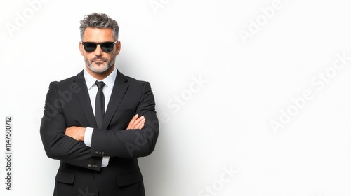 Confident Stylish Businessman in Suit and Sunglasses Standing with Arms Crossed Against a Plain White Background, Exuding Professionalism and Attitude