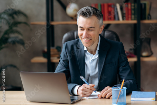 Confident successful handsome caucasian gray-haired man, manager or business leader, sitg in the office, communicating with employees via video conferencing, conducts broadcasting, taking notes,smile