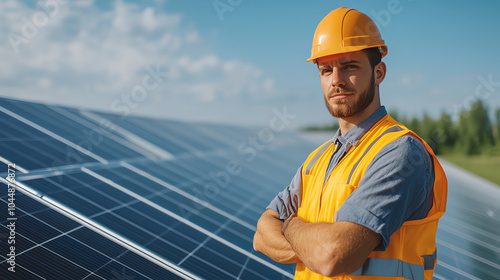 Confident worker in safety gear standing in front of solar panels, showcasing renewable energy commitment and professionalism.