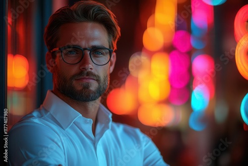 confident young professional man in white business attire striking dynamic pose against vibrant neon-lit urban background with modern gradient