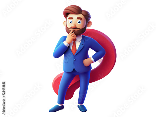 Confused 3d cartoon character businessman with question mark.