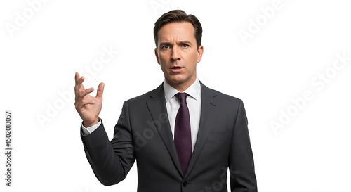 Confused Man in a Suit Isolated on White Background Raising His Hand Anxious