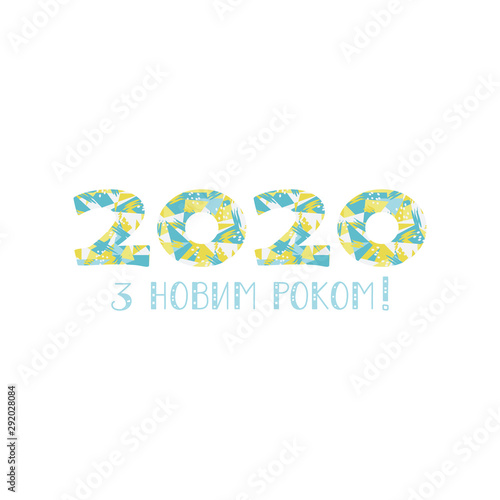 Congratulation card. Happy New Year 2020 - in Ukrainian. Vector illustration. Lettering. Ink illustration. Triangular