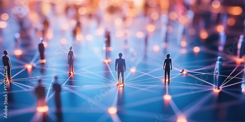 Connected figures standing on a digital network, symbolizing communication and collaboration in a virtual environment.