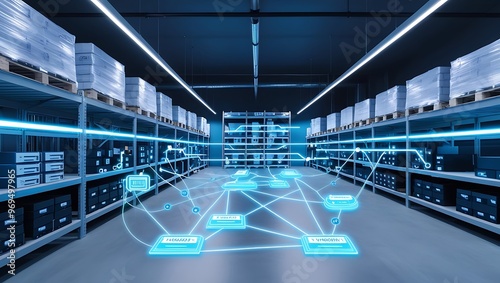 Connection network in servers data center room storage systems. Digitalization of Internet Traffic. Complex Electric Equipment Warehouse.