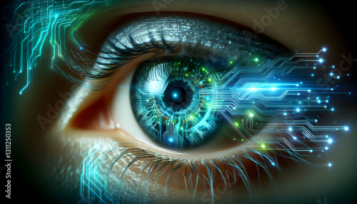 Consciousness A close-up view of a human eye, where the iris is transformed into a dynamic circuit board, glowing 1