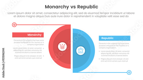 Constitutional monarchy vs republic comparison or versus concept for infographic template banner with big slice half circle with line separation with two point list information