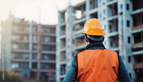 Construction concept. at back of the construction worker head which is wearing the safety helmet and checking work at the construction site. Non-existent person. Generative Ai