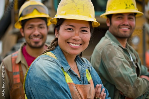 Construction Crew Portrait: Three smiling construction workers, a woman and two men, wearing hard hats and work uniforms, stand shoulder to shoulder, exuding confidence and teamwork