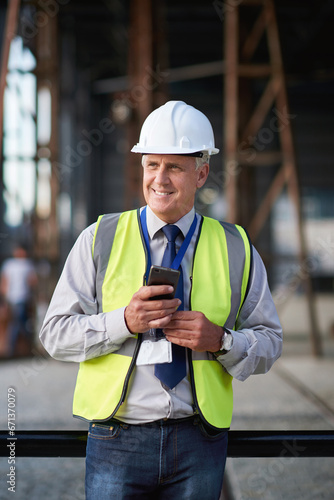 Construction, engineer and man with phone thinking outdoor about building project management. Contractor person and smartphone for civil engineering, safety and development at site for vision or idea