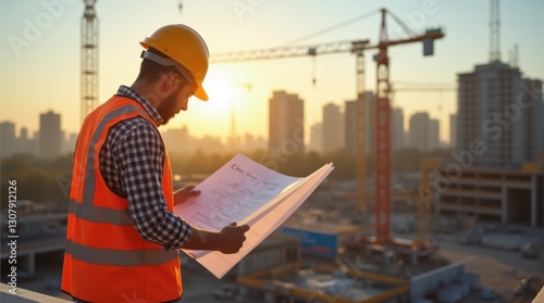 Construction Engineer Reviewing Blueprints On-Site