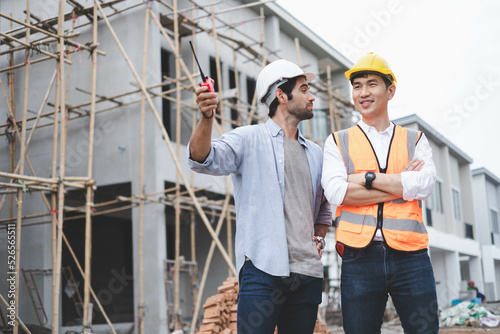 construction engineering project concept. Engineer and businessman handshake at construction site. portrait of Construction worker.