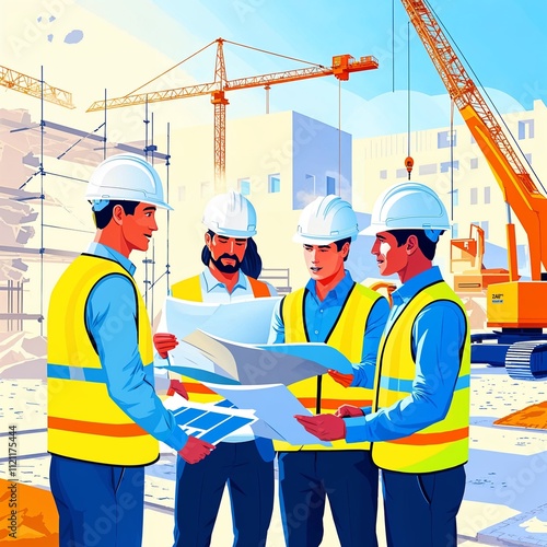 Construction Engineers Working at Site Detailed Illustration of Engineers Collaborating