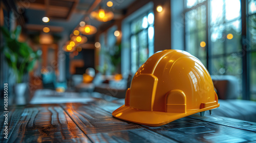 Construction helmet on a wooden table, blending work and leisure in a modern setting. Safety first!