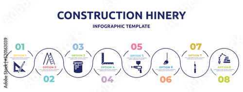 construction hinery concept infographic design template. included ruler and pencil, ladder open, paint can open, corner ruler, spray gun, mop, leather cutter, trucking icons and 8 option or steps.