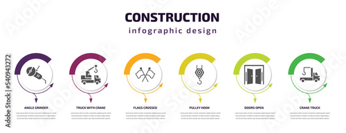 construction infographic template with icons and 6 step or option. construction icons such as angle grinder, truck with crane, flags crossed, pulley hook, doors open, crane truck vector. can be used